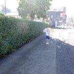 今日のやまびこ交通安全教室は 実際に傘をさして道路を歩く練習です。 歩く前に「ドキドキする」「どの道を歩くのですか?」